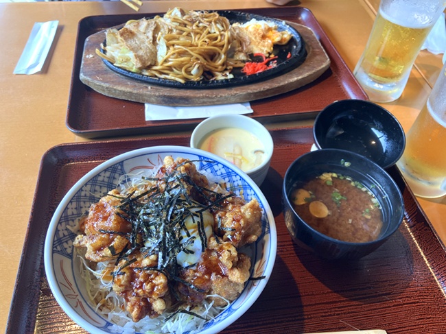 姉さんと温泉♨️姉さんは焼きそば、私は唐揚げ温玉丼とビール🍻
