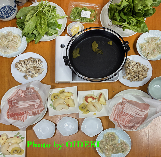 豚しゃぶ(常夜鍋)と手作り蒸し海老餃子とフルーツ盛り