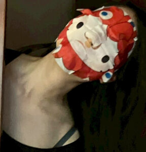 キティちゃんがミャクミャクのかぶりものしてるフェイスマスクをつけた長女