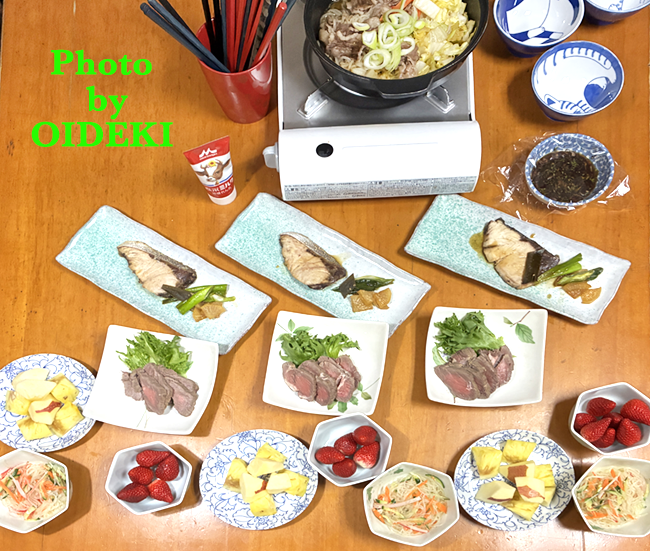夕飯ですよ|おひいさん 公開済み: 2026年3月18日更新: 2026年3月18日作成者: nasiカテゴリー: 食物タグ: OIDEKI, 節約ごはん 夕飯ですよ 先週末の長女飯・・・おひいさんのご機嫌を損ねないよう フルーツ多めに(笑 ●ビーフレモンサラダ ●はっさく ●りんごとパイナップル ●手作り餃子 ●ごはん炊いています(もち麦・16種雑穀入り) ●ローストビーフ/レタス ●ぶりの照り焼き/ネギと大根 ●りんごとパイナップル ●イチゴ ●春雨サラダ ●すき焼き風煮物 ●ごはん炊いています(もち麦・16種雑穀入り) ランキングに参加しています、ポチッと押していただけると大喜びします。 関連記事 夕飯ですよ|河内晩柑みたいですね🌕 夕飯ですよ 公開済み: 2024年5月17日更新: 2024年5月17日作成者: nasiカテゴリー: 食物タグ: OIDEKI 夕飯ですよ|精進料理 夕飯ですよ 公開済み: 2021年10月19日更新: 2021年10月19日作成者: nasiカテゴリー: 食物タグ: OIDEKI, 節約ごはん ごはんですよ〜プレミアムフライデー♪ ごはんですよ〜 公開済み: 2017年5月27日更新: 2017年5月27日作成者: nasiカテゴリー: 貯金・節約, 食物タグ: OIDEKI, 節約ごはん